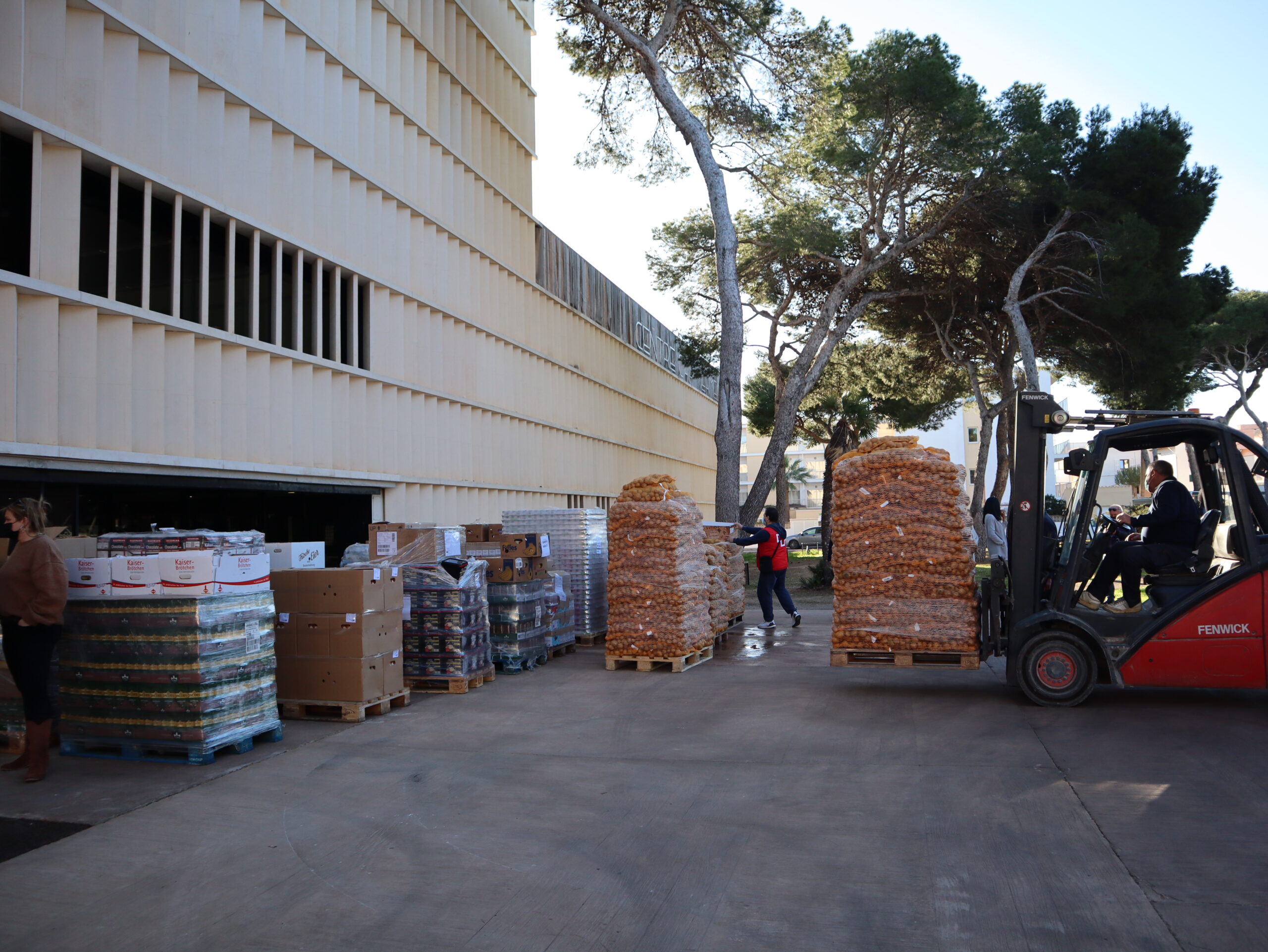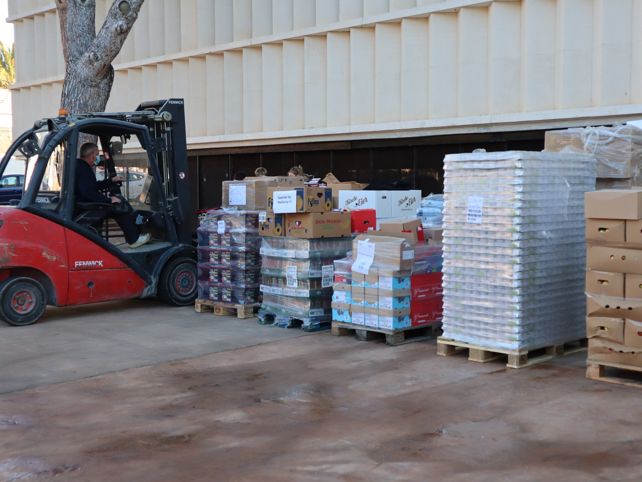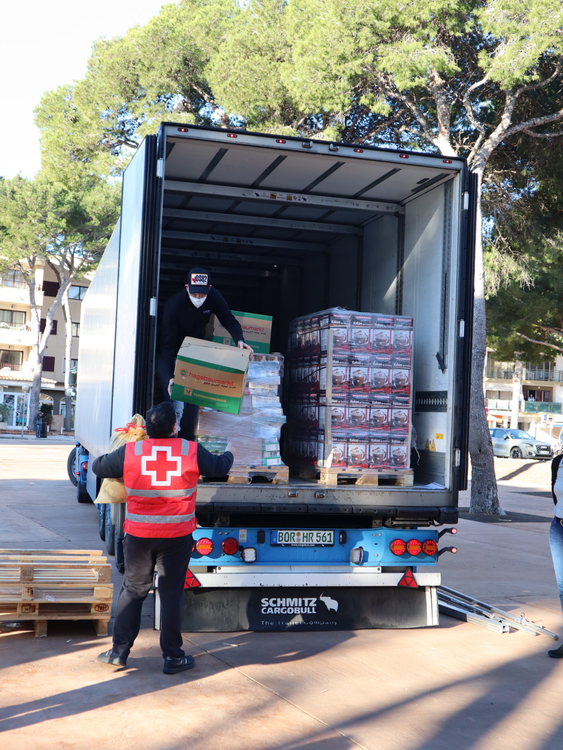 For unloading the truck and transporting the aid goods inside the town hall, hand lift trucks and a pallet truck were needed, which were provided by the Capdepera Town Council and transported by the family Soler (GRUP STEH). The Social Services Department of Capdepera Town Hall took care of the permits and the municipal police escorted the truck from the Capdepera industrial area to the unloading point. The brigade and the workers of “Projecte Millora” also actively supported the project. The Social Services Department and the Red Cross ensured that the aid goods were delivered and distributed to the people in most need.