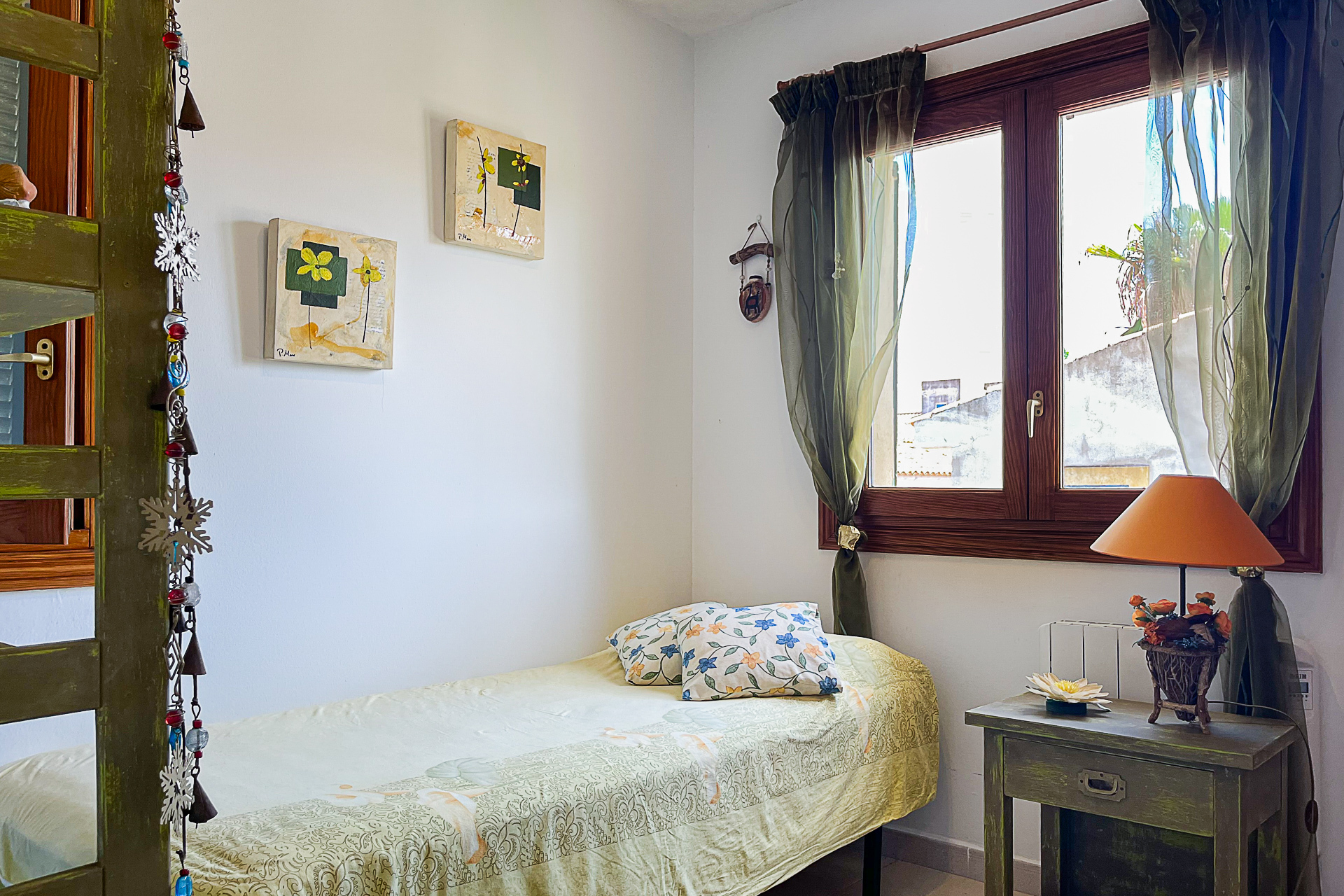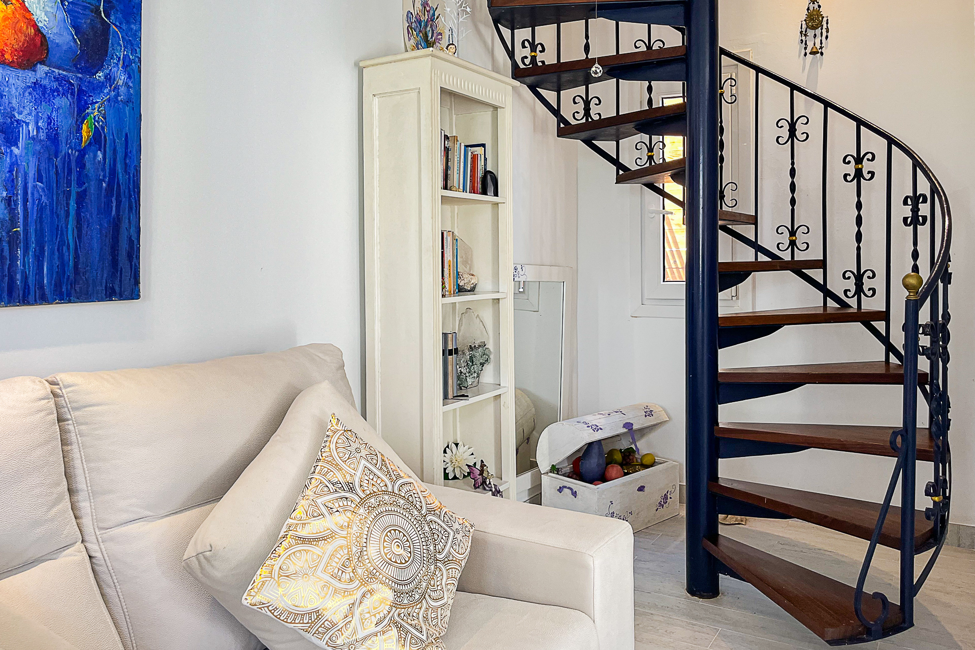 A spiral staircase in the living area leads to the upper floor, where you will find a comfortable double bedroom and a single bedroom. The utility room is also located on the upper floor, offering a practical solution for storing household items. A stylish bathroom with natural light and a bathtub completes this floor.