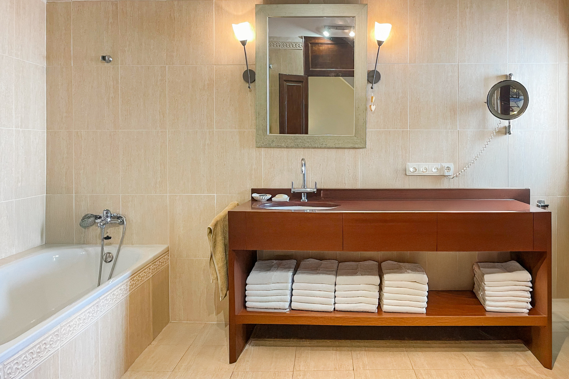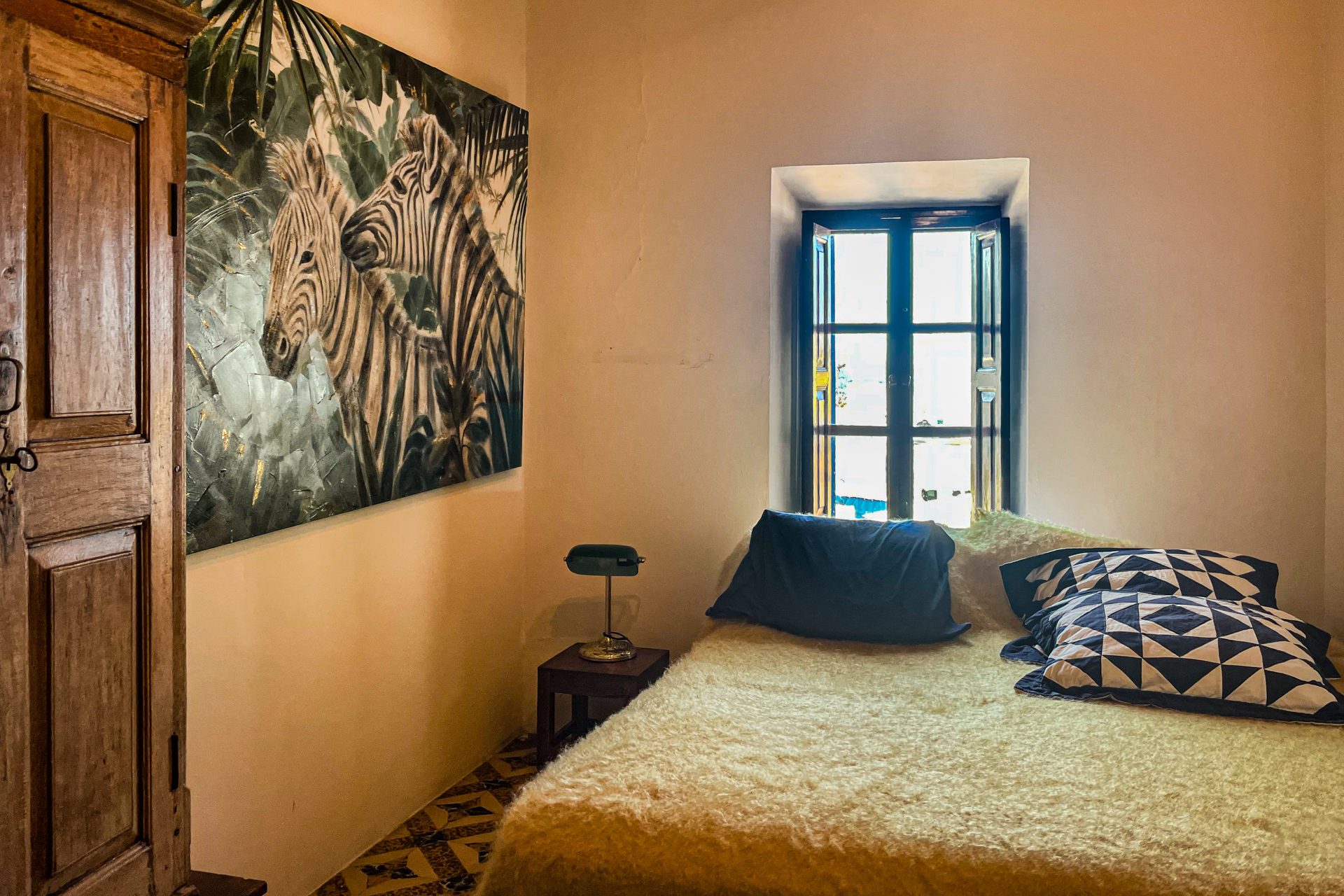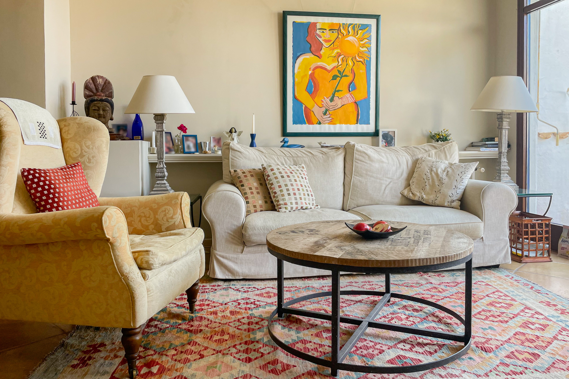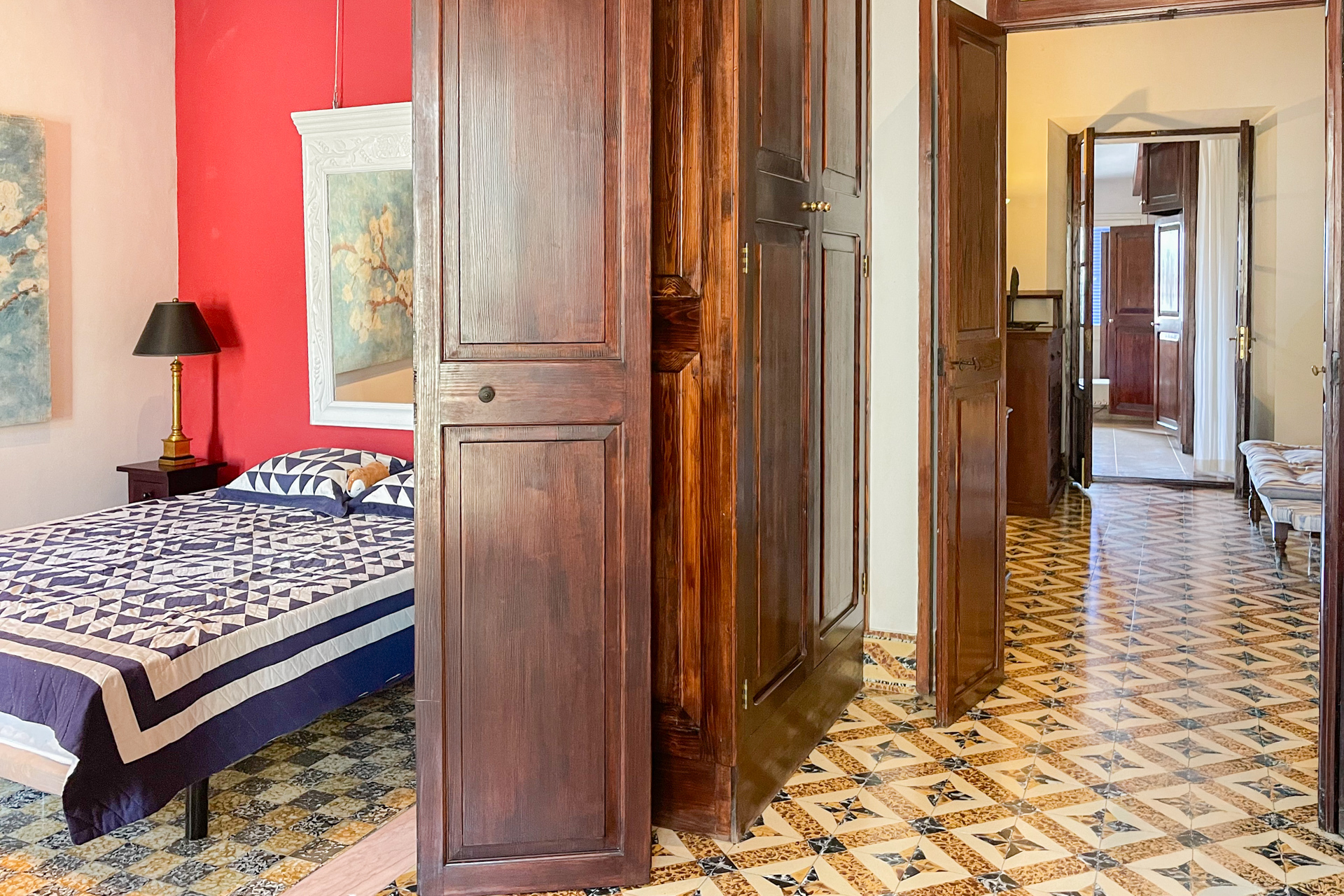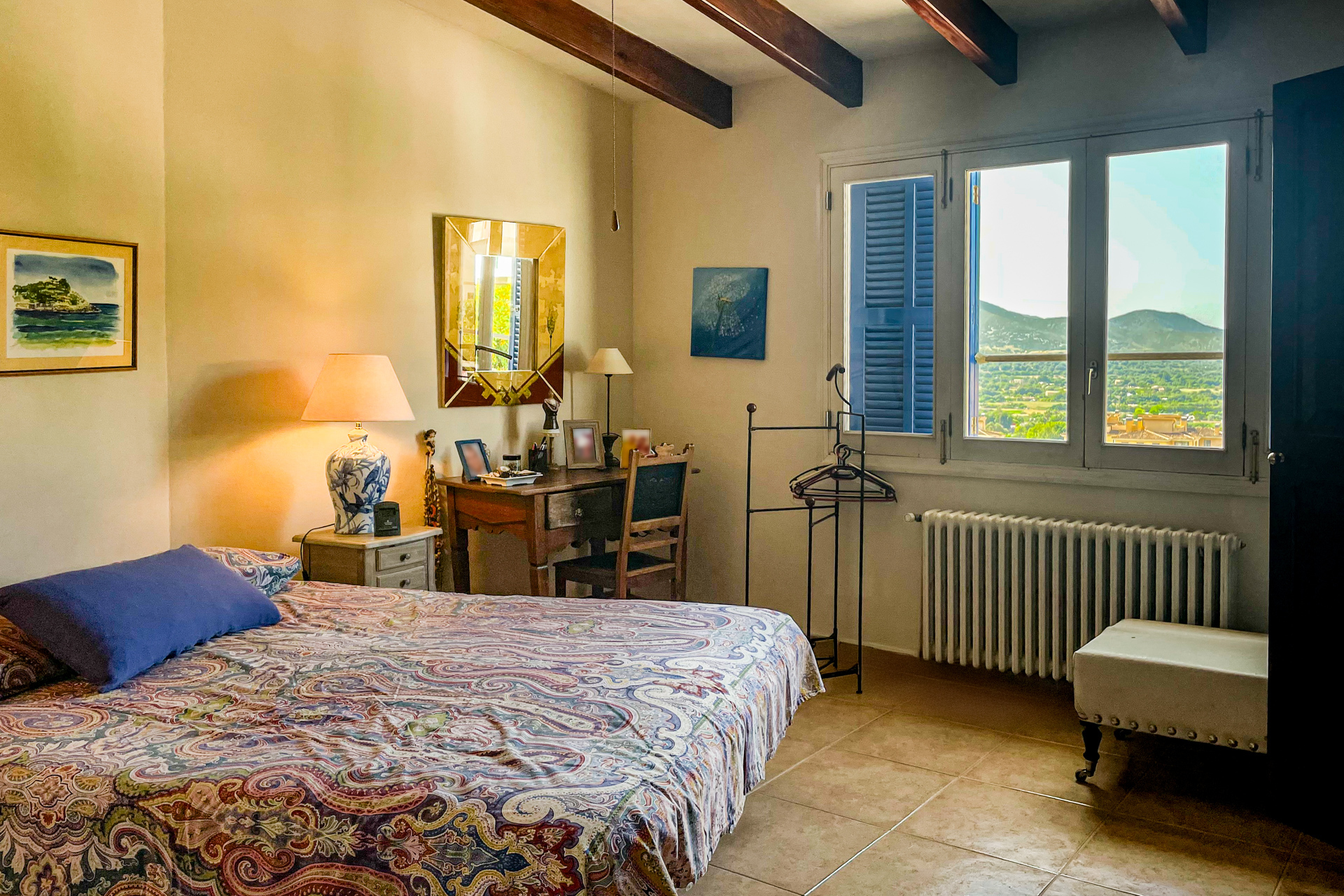 Half a level up is a first bedroom. One level above are two more bedrooms, an office, and a generous bathroom with shower and bathtub. One of the bedrooms offers a magnificent view of the castle of Capdepera illuminated at night—a charming detail with special appeal.