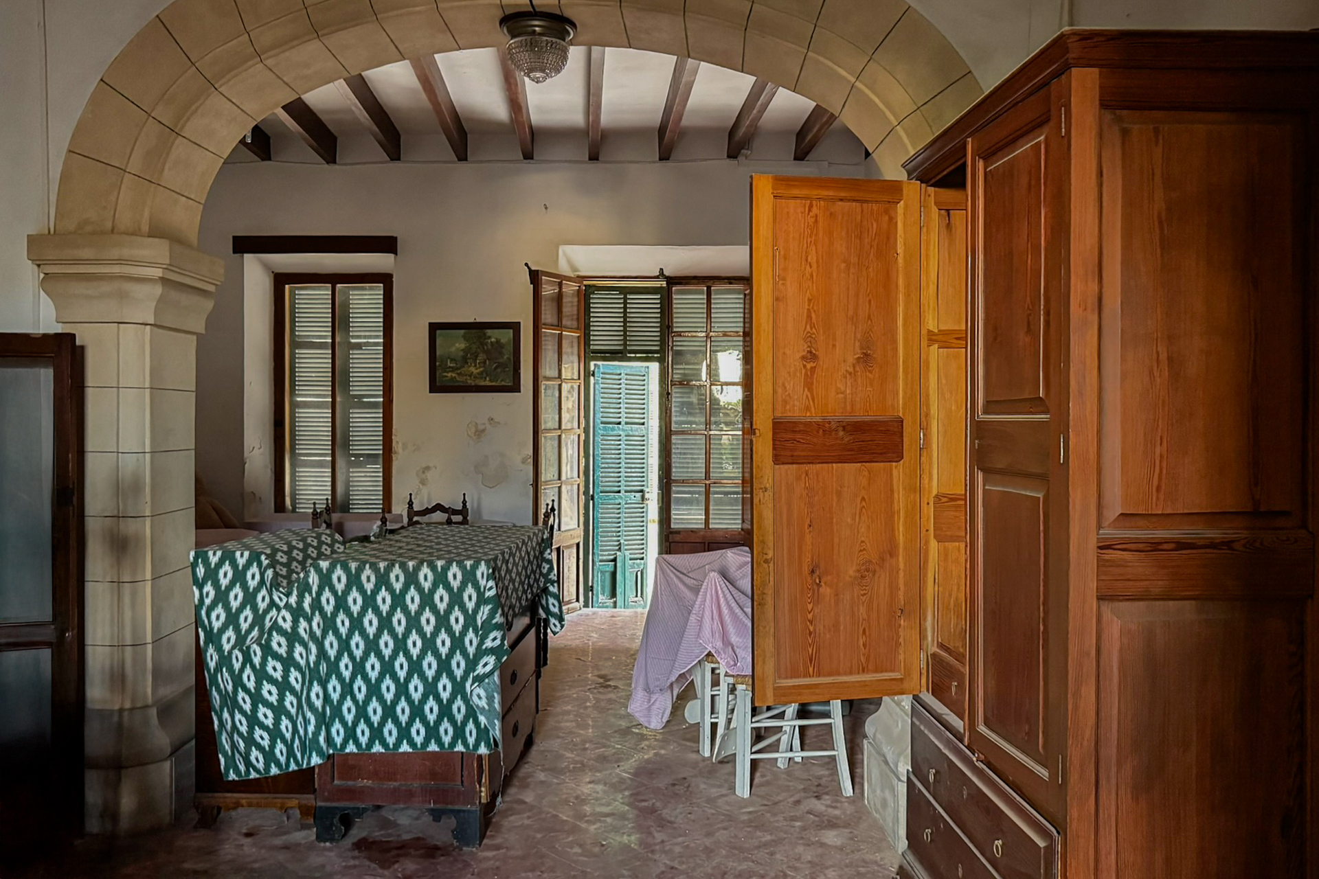En la planta baja se encuentra un amplio vestíbulo con techos altos y un característico arco Mares, que le da a la casa su encanto tradicional. Desde el salón se accede a un espacio con chimenea que conduce a la cocina. Además, en esta planta hay un dormitorio. La planta superior alberga cuatro dormitorios adicionales. Una escalera lleva desde aquí a la terraza en la azotea, ofreciendo espacio adicional para uso o diseño.
