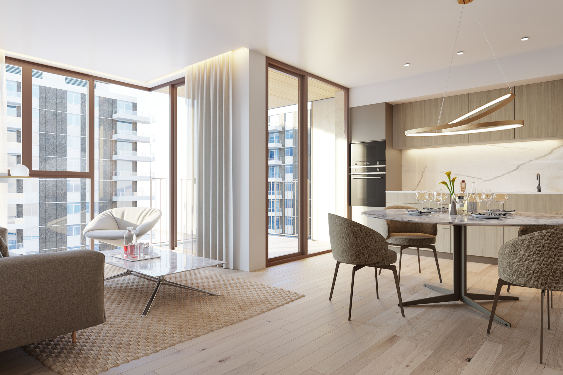 Die Wohnung verfügt über eine Wohnfläche von ca. 103 m² und eine Gesamtfläche von ca. 234 m², einschließlich großzügiger Terrassenflächen. Der offene Wohn- und Essbereich mit integrierter Küche erstreckt sich über große Fensterfronten hinaus auf die weitläufige Terrasse – ein fließender Übergang zwischen Innen- und Außenraum.