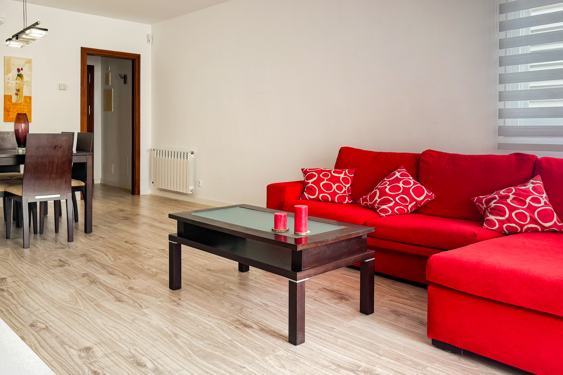 Das geräumige Wohnzimmer mit Balkonzugang ist hell und einladend. Über einen Flur sind die drei Schlafzimmer zu erreichen. Die Wohnung verfügt über zwei Badezimmer: ein Badezimmer mit Badewanne und ein en-Suite-Badezimmer mit Dusche.