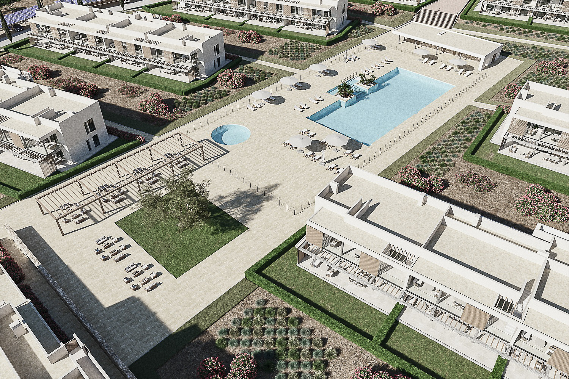 Die Wohnanlage besticht durch einen wunderschönen gemeinschaftlichen Außenbereich mit Rasen, Hecken und Bäumen. Eine weitere Besonderheit ist der Salzwasser-Gemeinschaftspool mit Außendusche in der Mitte des Areals sowie der Fitnessraum.