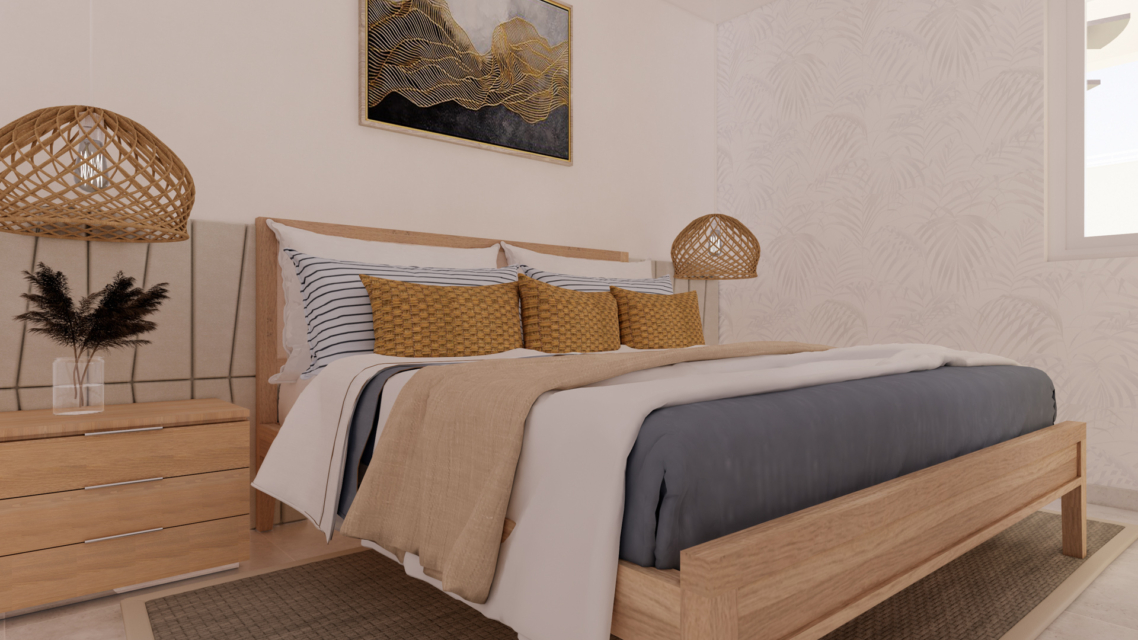Zum Angebot stehen verschiedene Wohnungstypen – unter anderem diese hochwertige Etagenwohnung im zweiten Obergeschoss mit einer Wohnfläche von ca. 87 m². Sie verfügt über zwei Schlafzimmer, eines davon mit einem Bad en Suite, sowie über ein zusätzliches Duschbad. Der offen gestaltete Wohn- und Essbereich ist mit einer modernen Einbauküche ausgestattet. Ein separater Hauswirtschaftsraum bietet zusätzlichen Stauraum. Ein überdachten Balkon rundet das Angebot ab – ideal zum Entspannen oder für gesellige Abende im Freien. Die Wohnung ist mit einer Klimaanlage (warm/kalt) ausgestattet und bietet ganzjährigen Wohnkomfort.